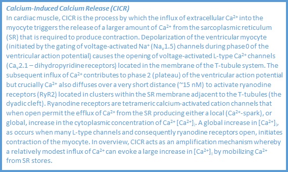 In cardiac muscle, which due to its high level of electrical activity is particularly reliant upon the Na+/K+-ATPase to maintain appropriate ion gradients across the plasma membrane, inhibition of the pump causes an elevation of the intracellular concentration of Na+ ([Na+]i). This is accompanied by a small reduction in the resting (diastolic) membrane potential of cardiac muscle cells because the pump is electrogenic (i.e. pumps 3 Na+ out: 2 K+ in for each transport cycle at the expense of one molecule of ATP hydrolysed to ADP and Pi). The subsequent reduction in the electrochemical gradient for Na+ entry secondarily reduces the expulsion of Ca2+ from the cytoplasm during diastole by the plasma membrane Na+/Ca2+ exchanger (NCX1) operating with the stoichiometry 3 Na+ in: 1 Ca2+ out during each transport cycle. This occurs because the operation of the Na+/K+-ATPase (primary active transport) is required to maintain the secondary active transport mediated by NCX1. The excess Ca2+ is sequestered into the lumen of the sarcoplasmic reticulum (SR) by the Ca2+-ATPase (SERCA2a) within the membrane of that organelle. Thus, additional free Ca2+ is available for release from the SR lumen during the plateau phase (phase 2) of the ventricular action potential by the process of calcium-induced calcium release (CICR). The latter process is elaborated upon in the textbox. The cytoplasmic Ca2+ transient that ensues and generates systole is thus elevated and via increased occupation of the cardiac isoform of troponin-C (TNNC1) by Ca2+ translates into an increase in cardiac contractility.